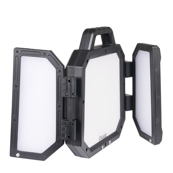 AGGE Workcase er en meget effektiv og kraftfuld arbejdslampe med et flerdimensionelt og taskelignende design, der tilbyder passende belysning til alle typer arbejdspladser. Takket være de foldbare sider kan lyset enten rettes bredt ligeud, eller det kan udvides i flere retninger, så f.eks. væggene i et rum, der er ved at blive renoveret, kan belyses jævnt. AGGE Workcase spreder lys med en behagelig farvetemperatur på 4000 Kelvin og en maksimal lysstrøm på op til 11.000 lumen, som tilsammen skaber en lysstråle, der er velegnet til opgaver med høj præcision. Desuden er lyset ikke anstrengende eller irriterende for øjnene, selv ved længere tids arbejde. Arbejdslyset har også en lavere lysstrøm på 6400 lm, så belysningen kan tilpasses rummets størrelse, så man undgår at overbelaste øjnene med for meget eller for lidt lys. AGGE Workcase vejer kun 3,5 kg, og takket være det behagelige bærehåndtag er den let at flytte fra et sted og arbejdsområde til et andet.