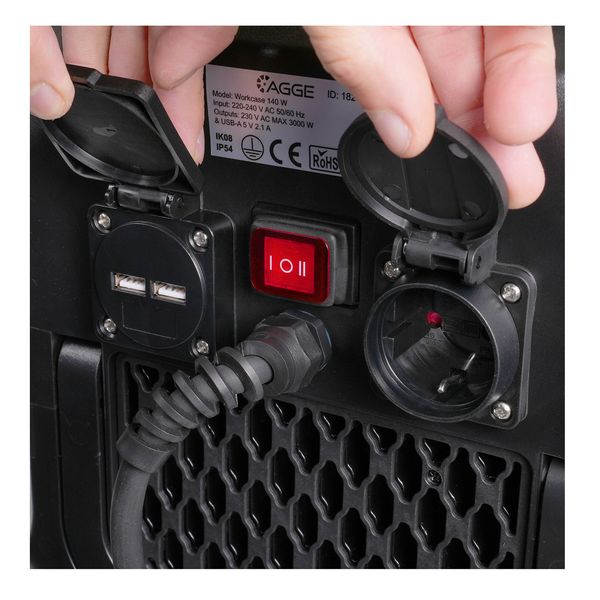 AGGE Workcase kan placeres trygt og sikkert på gulvet eller på et hvilket som helst niveau ved hjælp af støttebenet på bagsiden af arbejdslampen, da den er skabt til at modstå de belastninger, der uundgåeligt opstår på en byggeplads, såsom støv, fugt og stød. Derfor har arbejdslampen en slagfasthedsklasse IK08 og en beskyttelsesklasse IP54. Det betyder, at den kan modstå f.eks. byggestøv på byggepladser, eller hvis den ved et uheld bliver stødt under en renovering. På bagsiden af Workcase er der et stik, som kan bruges til at drive f.eks. en boremaskine eller en lille bordsav, og lampen er også udstyret med to USB-A-udgange, som kan bruges til at oplade pandelamper og lommelygter eller f.eks. din mobiltelefon. Et års (12 måneder) garanti!