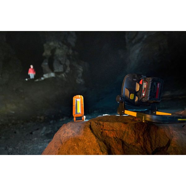 Ud over sine lysegenskaber af høj kvalitet er Workmate også udstyret med alsidige justerings- og monteringsmekanismer, der giver dig masser af fleksibilitet i forbindelse med placeringen af lampen. Lampen kan f.eks. placeres på gulvet eller på et bord som normalt, den kan fastgøres til enhver metaloverflade ved hjælp af de kraftige magnetfødder i bunden af stativet, eller den kan hænges op fra stativet ved hjælp af den svingbare krog. Selve lampen kan drejes hele 180° fra foden, så lyset altid er rettet i den rigtige retning. Der er også monteret en USB-port i lampens krop, så det er nemt at oplade f.eks. en mobiltelefon eller en pandelampe. Workmate er udstyret med en beskyttelse mod overafladning af batteriet, som forhindrer, at batteriet løber for lavt ned, hvilket kan beskadige det eller reducere dets kapacitet.