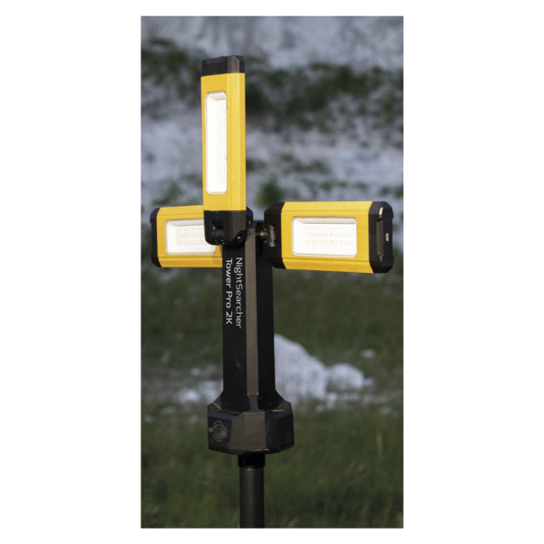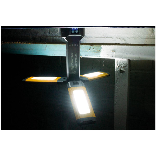 NightSearcher Tower Pro-2K er en alsidig genopladelig arbejdslampe som er god til krævende arbejdsbrug, både indendørs og udendørs med et lysflow op til 2000 lumen. Det foldbare design, de tre vinklingsbare armaturer, det medfølgende stativ samt den justerbare farvetemperatur er nogle af arbejdslampens funktioner som gør den til et pålideligt og fleksibelt alternativ til de fleste arbejdssituationer. Lyset er meget enkel at anvende og takket være de alsidige monteringsmuligheder gør den til en unik arbejdslampe. NightSearcher Tower Pro-2K kan hænges op, monteres på overflader af metal eller monteres på det medfølgende stativ, som er justerbar mellem 0.66 og 1.5 meter. I og med at NightSearcher Tower Pro-2K drives af et genopladeligt batteri er den meget god til anvendelse i miljøer hvor der ikke findes tilgang til elektricitet.