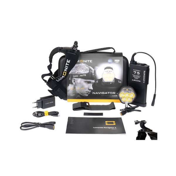 Lampens batteri opbevares i den medfølgende batterivest. Det er også nemt at sætte den fast i bæltet, eller lægge den i lommen eller rygsækken. Lampen fastgøres nemt til hjelmens lufthul ved hjælp af en velcrostrop, som er velegnet til alle typer af cykelhjelme. Pakken indeholder også en monteringsløkke, der kan bruges til at fastgøre lygten til cykelstyret. Pandebånd og forlængerledning medfølger også, og med disse kan du nemt bruge Navigator som en almindelig pandelampe!