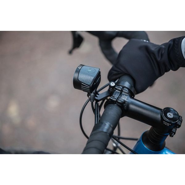 Kraftig, GoPro-kompatibel cykellygte, der giver synlighed både langt fremme og bredt ud til siderne. Det eksterne batteri er velegnet til krævende offroad-cykling såvel som til bykørsel og sikrer længere køretider end normalt! Oplyst lysflow på 2000 lm, IPX4-beskyttelsesklasse.