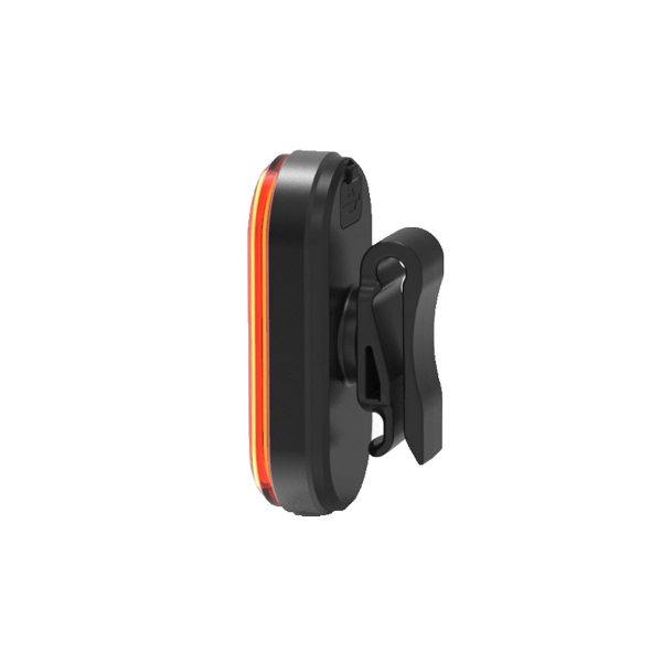 Stilren, genopladelig baglygte med flere forskellige effektniveauer og funktioner. Nem at montere og fjerne fra sadelstolpen. 100 lm lysflow.