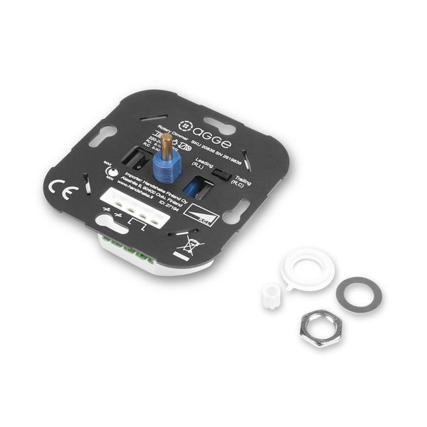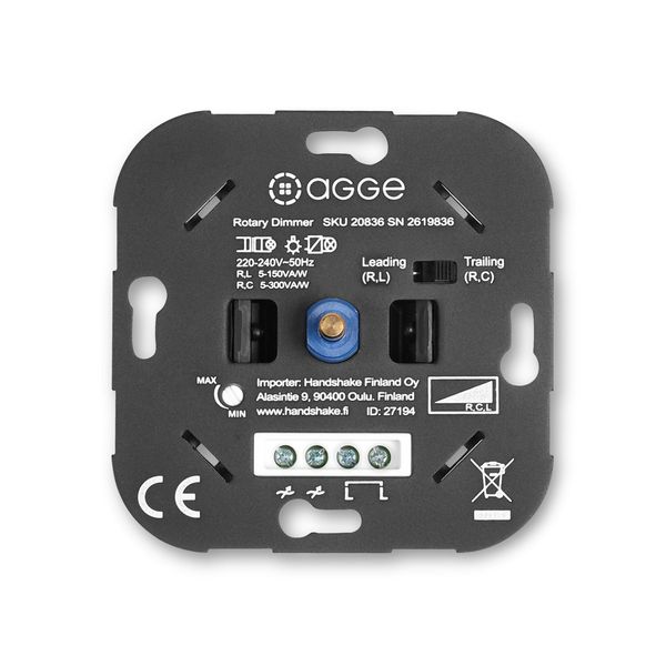 AGGE Universal Rotary Dimmer er en moderne dæmperknap med drejeknap, som gør det muligt at tænde og slukke fast installeret belysning ved at trykke på knappen samt trinløst justere lysstyrken ved at dreje på knappen. På dæmperen kan du vælge enten RL- eller RC-dæmpning, hvilket gør den kompatibel med stort set alle dæmpbare armaturer på markedet. Dæmperen kan indstilles til både RL- og RC-dæmpning med belastning på 10–150W (RL) eller 5–250W (RC). Beregnet til installation i tørre indendørsrum ifølge kapslingsklasse IP20. Dæmperen er direkte kompatibel med de mest almindelige dækkrammer på markedet, så installationen er enkel med en ramme, der passer til din indretning. To års (24 måneders) garanti!