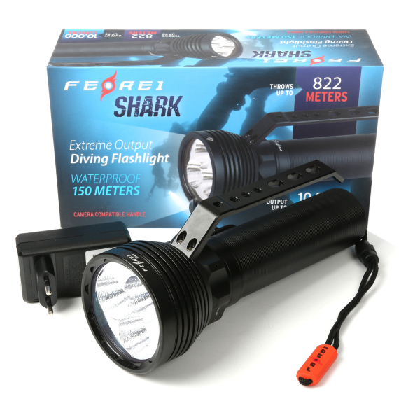 Ferei SHARK er en utrolig effektiv genopladelig dykkerlygte der er specielt udviklet til krævende professionel brug. Lygten er udstyret med tre avancerede CREE XHP70 LED'er, som ifølge producenten skulle give et lysflow på forbløffende 10.000 lumen og en rækkevidde på over 800 meter. Lygten er fremstillet af et tykt lag holdbart aluminium, og både batteriet og lampehuset er designet til at sikre maksimal ydeevne og holdbarhed selv i de mest krævende situationer. Den robuste konstruktion betyder, at du ikke behøver at bekymre dig om at lygten kan blive beskadiget af mindre stød. Lygten er trykbestandig og kan nedsænkes i vand på op til 150 meters dybde. Desuden er lygtens aluminiumshåndtag kompatibelt med bl.a. GoPro-kameraer.