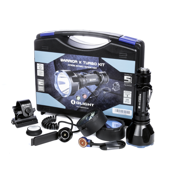 Olight Warrior X Turbo er et effektivt taktiskt søgelys med en utrolig 1000 meters rækkevidde! Ud over den fantastiske rækkevidde giver lygten hele 1100 lumen lysstrøm og en maksimal brændetid på 12,5 timer. Ligesom de andre lygter i Warrior-serien er X Turbo udstyret med en taktisk magnetisk switch, der også fungerer som et opladningsstik og forbindelse til fjernkontakter. I kombination med den magnetiske fjernbetjeningskontakt og det magnetiske våbenbeslag bliver Warrior X Turbo til en våbelygte i særklasse.