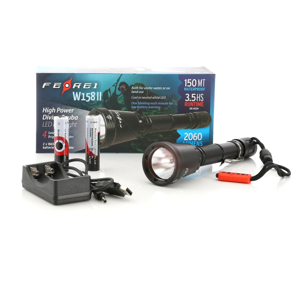 Ferei W158II er en pålidelig og driftsikker dykkerlygte, der er særligt velegnet til dykning på trange steder som vrag, omkring både og skibe, undervandsgrotter og tæt på bunden. Den drives af to genopladelige 18650-batterier og en CREE XHP50.2 LED, som giver et maksimalt lysudbytte på op til 2060 lumen, så det er en meget kraftig lygte i forhold til dens størrelse. Lygten kan tåle at blive nedsænket ned til 150 meter, og det CNC-fremstillede armatur af hårdt anodiseret aluminium og den optiske glaslinse kan uden problemer modstå trykændringer i dybden. Desuden bliver hver lygte tryk- og vibrationstestet individuelt, før den pakkes!