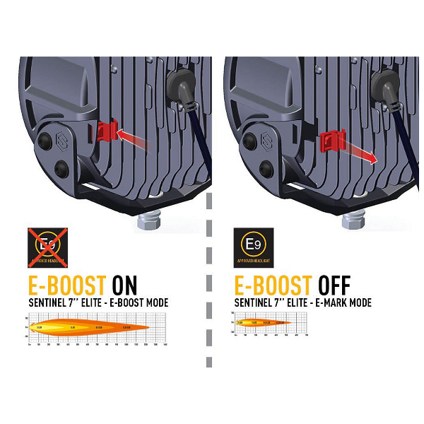 Dette lys er et UNECE-regulativ 149 fjernlys, der er blevet godkendt til vejbrug takket være den patenterede E-Boost-teknologi. E-Boost-teknologien giver mulighed for at bruge lampen med mindre effekt i vejtrafik og med højere effekt uden for normal vejtrafik, såsom på lukkede veje. Se et billede af til- og frakobling af E-Boost-tilstand her. E-Boost-tilstanden er IKKE godkendt til vejkørsel.