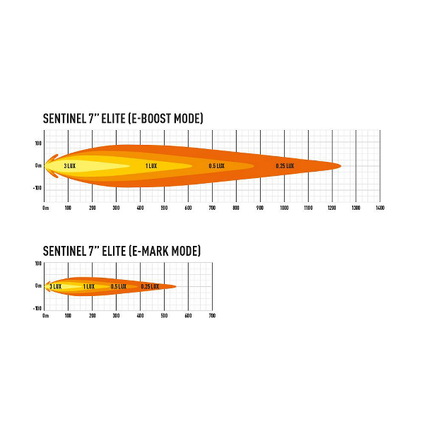 7-tommer Elite-modellen af den populære fjernlysserie! E-Boost-tilstand og tofarvet parkeringslys (hvid og orange). Lysflow på 10248 lumen, rækkevidde 616 meter @ 1 lux.