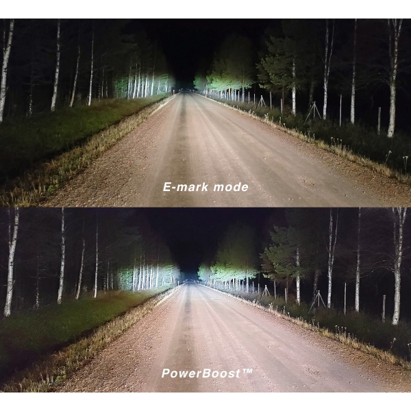 E-mærket - De fleste fjernlys ramper som i dag sælges har en såkaldt E-mærkning. Det betyder at man får et krav på sig som fjernlys producent, at produktet skal effekt beregnes for at være trafik godkendt for visse lande i europa. I Danmark har vi ikke dette krav, men mange fjernlysramper som sælges, har stadig mærkningen da de er producerede på det Europæiske marked. Dette gør at effekten bliver begrænset i næsten alle fjernlys (og meget endda). Med PowerBoost-niveauet aktiveret går man forbi E-mærkningen og kører “ALL IN” på fjernlysets effekt.