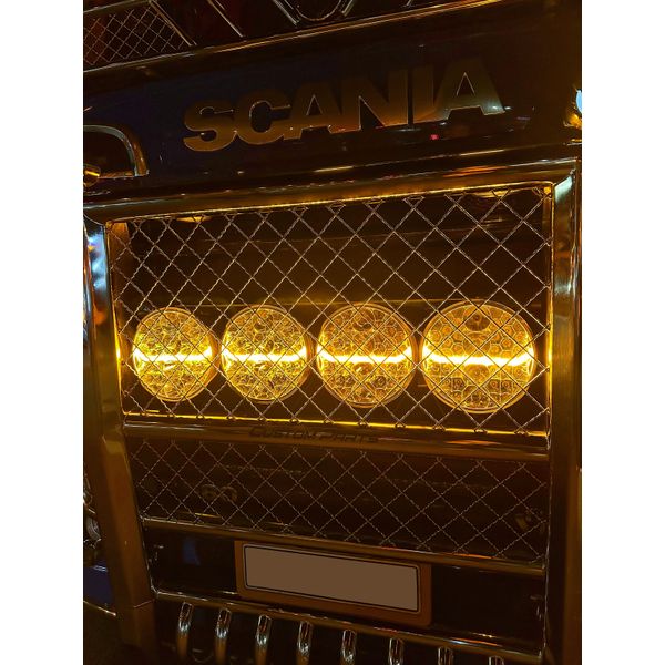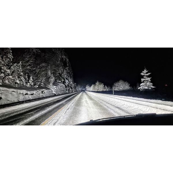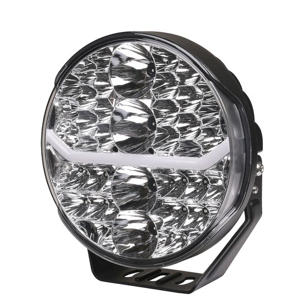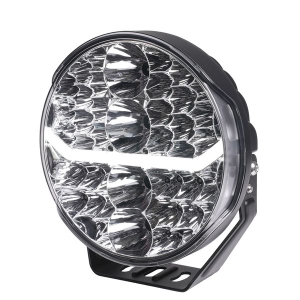 Et fjernlys med en kombineret smal og bred stråle, udstyret med to forskellige strømindstillinger og et tofarvet positionslys. Angivet lysflow 9500 lm, opmålt rækkevidde 892 m @ 1 lux.