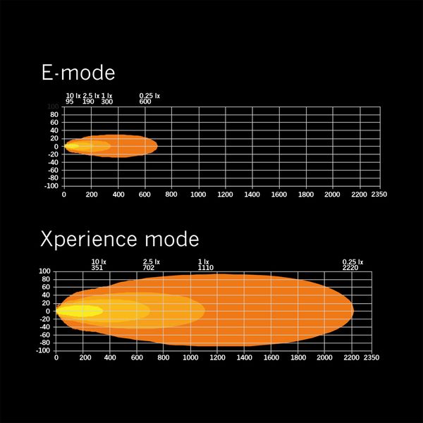 Kraftigt fjernlys i høj kvalitet, udstyret med to strømtilstande og et optimeret lysbillede. Fjernlyset er også udstyret med et tofarvet parkeringslys. Angiven lysstrøm 25 500 lm, rækkevidde 1100 m @ 1 lux. Kapslingsklasse IP68/69K.
