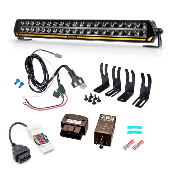 Sæt XBB-donglen i OBD-II-porten, hvorefter der igen kan sættes strøm til bilen. Download mobilapplikationen XBB Configurator, tilslut donglen til applikationen, og vælg i applikationen de kanaler, som du vil styre med XBB PowerUnit-relæet (fjernlys og evt. parkeringslys). Tilslut stikket i fjernlyset til relækabelsættet, og test forbindelsernes funktionalitet. Hvis du vil bruge parkeringslyset, skal du tilslutte relækabelsættets blå ledning til parkeringslyskablet (gult eller hvidt), der kommer fra fjernlysets strømkabel. Rengør grundigt de overflader, som holderen til fjernlyset skal monteres på. Fastgør bundbeslaget på holderen til fjernlyset til begge sider af fjernlyset, og juster fjernlyset efter monteringsstedet. Når du er tilfreds med den endelige placering af fjernlyset, skal du fjerne beskyttelsen fra 3M-tapen fra bundbeslagene og montere fjernlyset på plads. Fjern derefter fjernlyset fra det nederste beslag, og monter det øverste beslag i den korrekte position. Fastgør det øverste beslag til bilen med de medfølgende skruer, og sørg for, at lygten passer. Afslut installationen ved at montere fjernlyset igen og fastgøre beslagene.