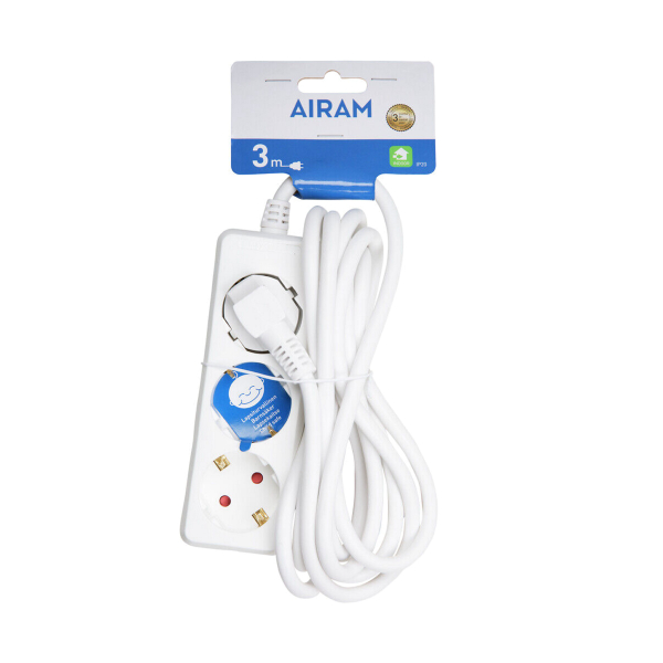 Traditionel forlængerledning til indendørs brug med tre outputs og 3 meter langt kabel. Forlængerledningen er både jordet og børnesikker. Maks. belastning 3680 W. Tre års garanti.