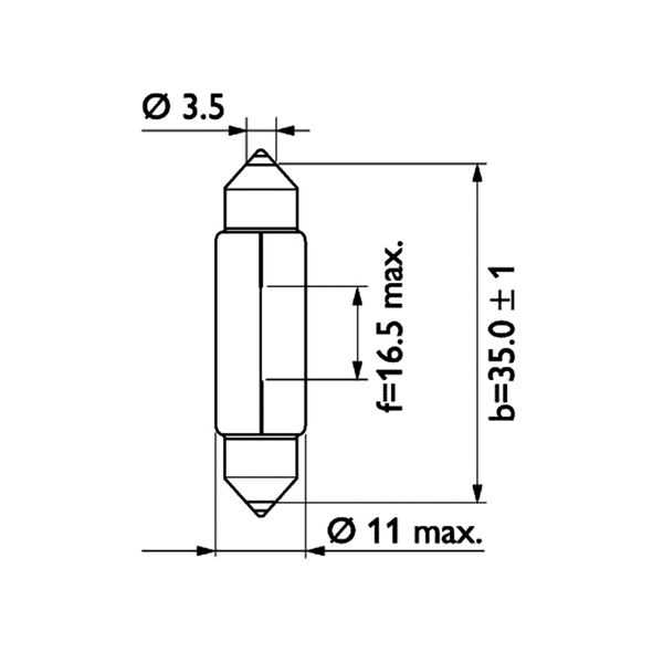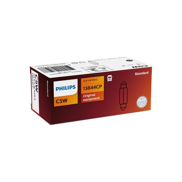 Philips C5W 24V halogenpære, specielt til tunge køretøjer med 24V-system. Lampesokkel SV8.5, nominel effekt 5W. ECE-godkendt.