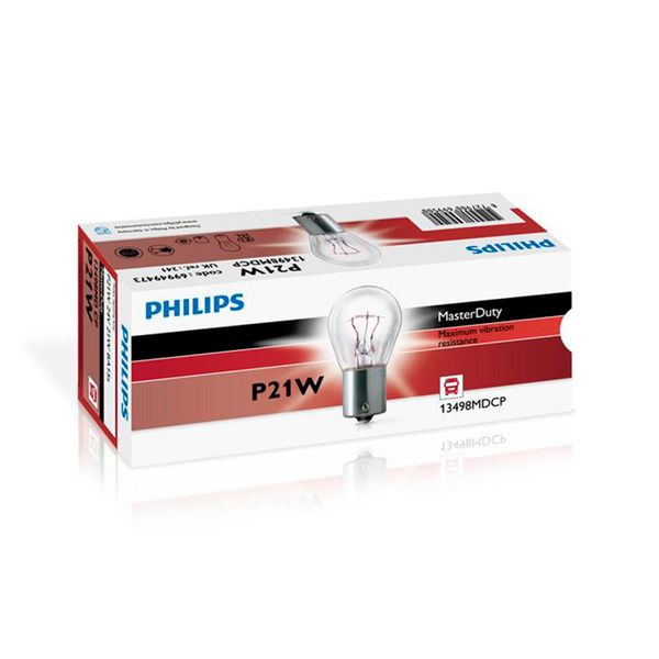 Philips P21W 24V MasterDuty halogenlampe specielt til 24V-systemer for tungt udstyr. Lampesokkel BA15s, nominel effekt 21 W. ECE-godkendt.