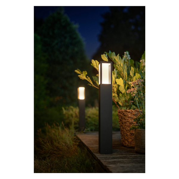Philips Hue Impress Post er en stilfuld og moderne havelampe, der er velegnet til havebelysning, og som kan styres via Philips Hue-appen. Impress-lampen giver et lyst og farverigt lys, hvilket gør den perfekt til generel belysning og stemningsbelysning i haven, og med en forbindelse til Philips Hue-smart belysningssystem kan lampen justeres til at skabe præcis det ønskede lys. Ud over den farveskiftende funktion kan lyset dæmpes trinløst via Philips Hue-appen. Lampen kan styres via Philips Hue Bridge, så alle dens funktioner kan bruges, f.eks. timing, som gør det muligt at planlægge lyset til at tænde, f.eks. hver gang du kommer hjem, eller når det bliver mørkt. Philips Hue Impress Post er kompatibel og fungerer problemfrit med Philips Hue-tilbehør som Hue Dæmpbar Kontakt og Hue Bridge, men lyset kan naturligvis også tændes og slukkes med en almindelig lyskontakt. Oplyst lysflow på 1180 lumen, farvetemperatur 2000 - 6500 Kelvin. To års garanti!