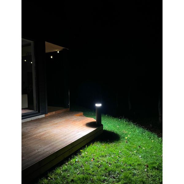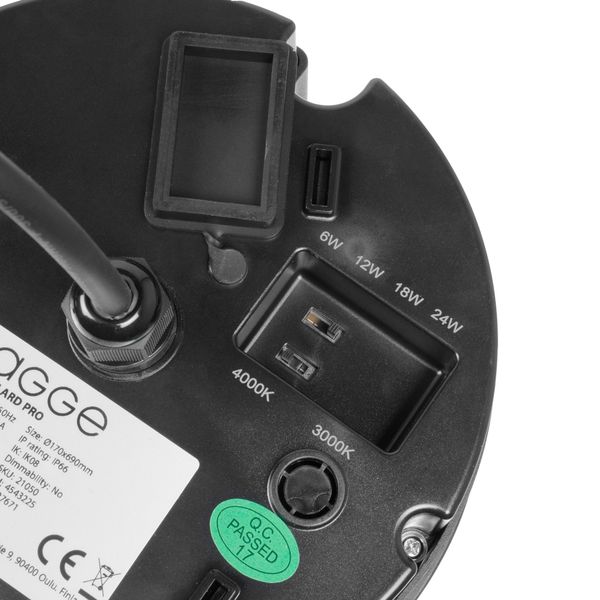 AGGE Flat Bollard PRO er en stilren pullert, der passer til belysning af gårdmiljøer ved offentlige bygninger og boliger, gangstier og beplantninger samt som almen- eller stemningsbelysning i haver og friluftsområder. Lampen har en fast LED, hvor effekten kan justeres i fire trin via en intern afbryder: 6 W, 12 W, 18 W eller 24 W (svarende til ca. 450/900/1350/1800 lm). Det gør det nemt at tilpasse lysstrømmen efter anvendelse og grundens størrelse. Også farvetemperaturen kan indstilles til varmhvid 3000 K eller neutralhvid 4000 K, hvilket giver enten blød og varm stemningsbelysning eller klarere almenbelysning. Den fuldt dækkende 360° lysvinkel og den jævne lysfordeling skaber en balanceret og harmonisk atmosfære. Farvegengivelsesindeks Ra 80 (CRI) gør, at omgivelsernes farver gengives naturligt, så detaljer, planter og gårdmiljøer ser levende og velbelyste ud.