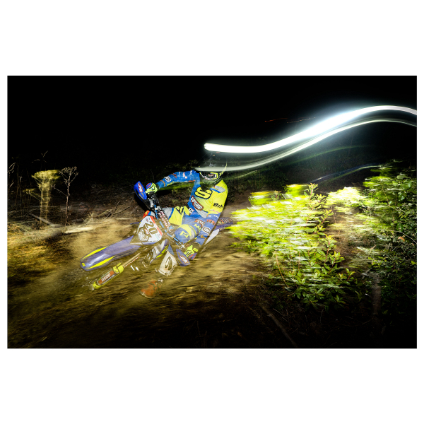 "In Enduro, the requirements for a racing lamp are brightness, a long and wide reaching beam and light weight. In this kit they are all standard! Incredible brightness in such a compact packet. The light is conveniently attached to the helmet with the Gopro bracket, so it is easy to install and remove if necessary! Battery life is good. I can recommend this light set for both amateurs and racers!!"