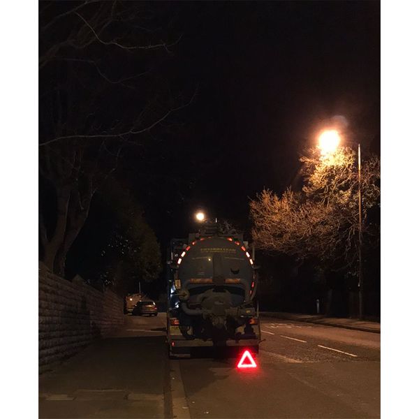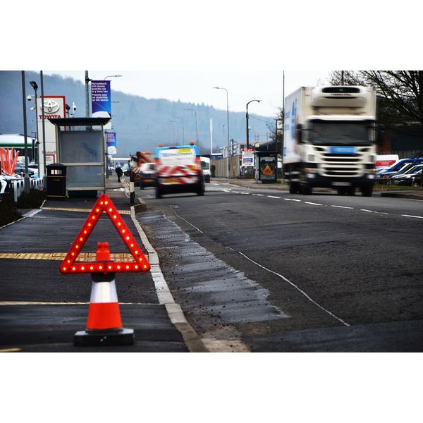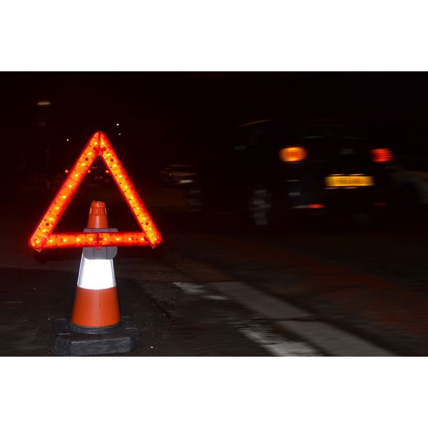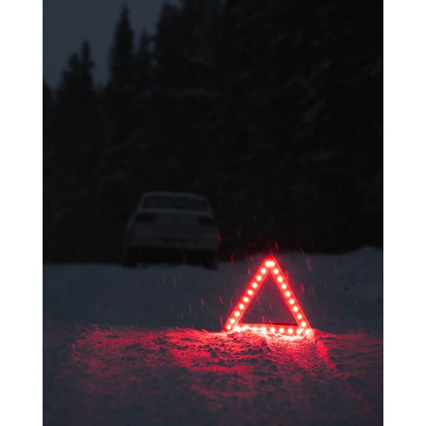 Europæisk fremstillet advarselstrekant af høj kvalitet med indbygget LED-advarselslampe. Synlig i mørke på op til 300 meters afstand!