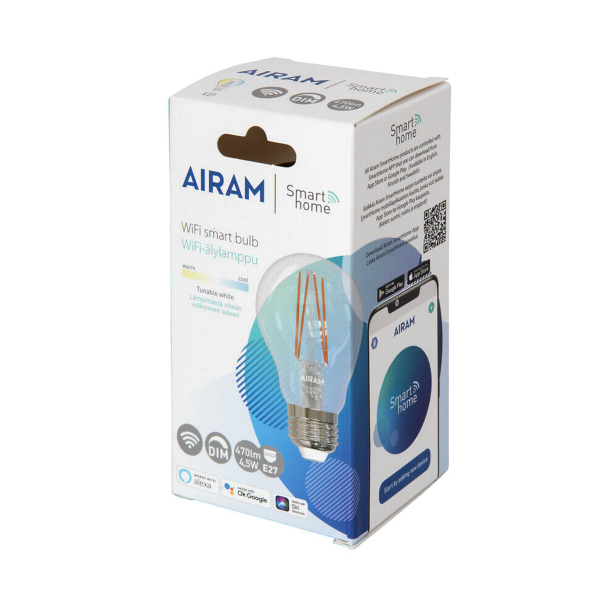 LED-pære med E27-sokkel, der kan styres via Airam SmartHome-appen. Justerbar farvetemperatur (2700K - 6500K), fuldt dæmpbar. Tre års garanti!