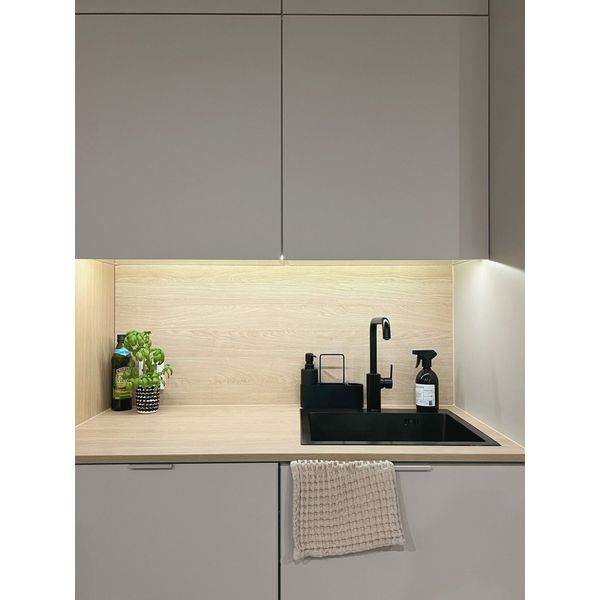AGGE 12V LED strip er en højkvalitets 10 W/m (855 lm/m) lysstrimmel til alle rum i hjemmet (IP65). Den er ideel til direkte belysning i bogreoler, skabe, garderobeskabe eller andre møbler. Den indbyggede fugtbeskyttelse gør det muligt at placere stripsen sikkert i nærheden af vand, f.eks. ved håndvaske eller badeværelsesarmaturer. Den fungerer også godt som stemningsbelysning i badeværelser eller i saunaer. Dette er en såkaldt COB-strip (Chip On Board), hvilket betyder, at lyskilden er en ubrudt linje uden synlige individuelle dioder. Resultatet er et helt ensartet lys uden punktvise effekter, hvilket sikrer et fuldt og ensartet lys. Båndet er dækket af ikke-gulnende silikone af høj kvalitet, som er usynlig for det blotte øje, hvilket betyder, at det også kan bruges i synlige installationer, uden at resultatet bliver grimt. AGGE 24V LED-strips fås i to farvetemperaturer: varm hvid (3000K) og neutral hvid (4000K). De fås i længder på 500 cm og kan klippes til, forlænges og dæmpes efter behov.