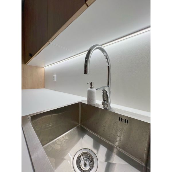 AGGE 24V LED-strip er en LED-strip af høj kvalitet, der giver et kraftigt lys på 1150 lm/m (10 W/m), specielt designet til indendørs brug. Takket være den høje lysstrøm er den ideel til direkte belysning i f.eks. bogreoler, skabe, garderobeskabe eller andre møbler. Den fungerer også perfekt som stemningsbelysning for at skabe et behageligt og jævnt lysbillede. Dette er en såkaldt COB-strip (Chip On Board), hvilket betyder, at lyskilden er en ubrudt linje uden synlige individuelle dioder. Resultatet er et helt ensartet lys uden punktvise effekter, hvilket garanterer et omfattende og ensartet lys. Stripsen fås i to farvetemperaturer: varm hvid (3000K) og neutral hvid (4000K), og det fås i længder på 250 cm eller 500 cm. Den kan klippes, forlænges og dæmpes efter behov.