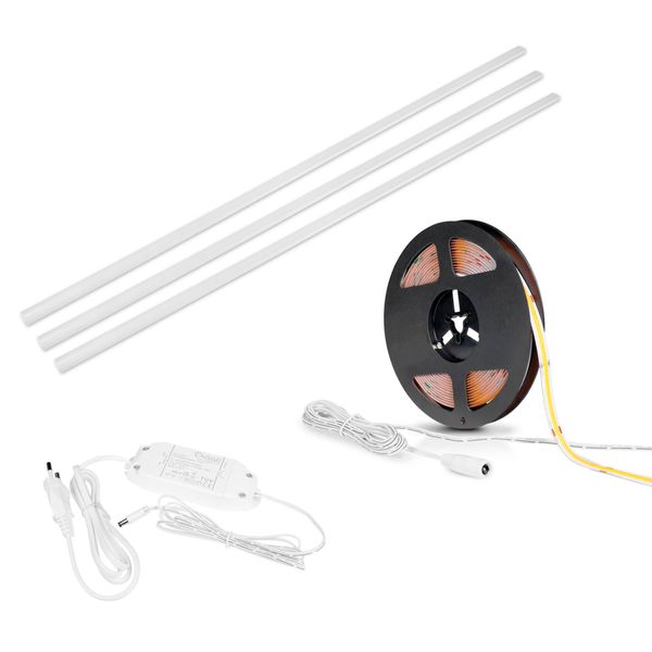 Et komplet LED-stripssæt designet til belysning af møbler. Indeholder LED-strips, transformer og hvide monteringsprofiler. Fås i varm 3000K eller neutral 4000K farvetemperatur. Både LED-strips og monteringsprofiler kan afkortes, så de passer til dine behov.
