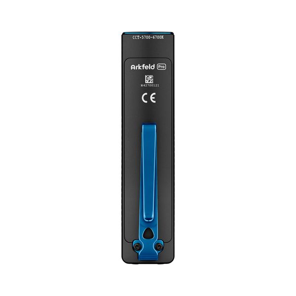 Arkfeld Pro er designet til at være nem at bruge, og alle funktioner kan styres med kontakten øverst på lampen: Ved at dreje på kontakten kan du skifte mellem laserpointer-, UV-lys- og lommelygtetilstand. De forskellige tilstande kan skiftes med hurtige tryk på kontakten. I Pro-modellen kan laserpointeren og det hvide lys også bruges samtidigt. Lampen kan holdes i hånden som normalt, eller den kan fastgøres til en metaloverflade ved hjælp af en magnet i bunden af lampen, så man har begge hænder fri til at arbejde. Arkfeld Pro er virkelig let, den vejer kun 111 gram, og takket være dens lille størrelse er den meget nem at bære rundt på til daglig. Lampen har også en lommeklemme på siden, som kan bruges til at fastgøre den til f.eks. en brystlomme eller rygsæk.
