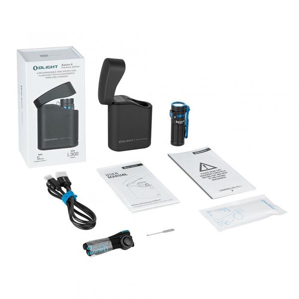 Premium-udgaven af Baton 4 er lidt anderledes end den "normale" Baton 4, da den også leveres med et transport-/opladningsetui, hvor lommelygten nemt kan oplades ved hjælp af et USB-opladningskabel. Etuiet fungerer også som en trådløs backup-strømkilde/oplader og har kapacitet til at oplade Baton 4 fra tom til fuld 5 gange, hvilket giver en brændetid på op til 190 dage! Takket være den lille størrelse kan opladningsetuiet og lygten nemt bæres i f.eks. en lomme, og når lygten bruges, kan den sættes på f.eks. et bælte eller et rygsækspænde ved hjælp af en lommeklemme.