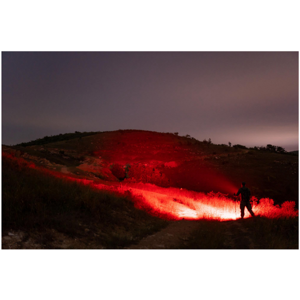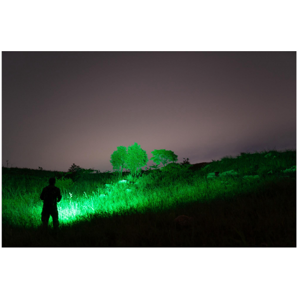 Ud over hvidt lys har Marauder Mini også rødt, grønt og blåt (RGB) lys. Disse kan bruges til jagt, kortlæsning, nattesyn eller andre situationer, hvor du ønsker at holde mørket så godt som muligt eller ikke ønsker at skræmme dyr med lyset. Så med denne alsidige lyspistol behøver du ikke separate farvefiltre, da alle de nødvendige funktioner findes i selve lampen. Selv om lampen har mange funktioner, er den meget nem at betjene takket være afbryderen og kombinationen af tryk-/drejekontakt på kroppen. Med afbryderen kan du skifte mellem den brede og smalle stråle med et hurtigt fingertryk. RGB-lyset og det hvide lys kan tændes ved hjælp af trykknappen, og lysets lysstyrke kan justeres ved at dreje på drejekontakten. Du kan ændre indstillingerne fra side til side med blot én finger, så du ikke behøver at flytte blikket hen til lampen for at ændre indstillingerne.