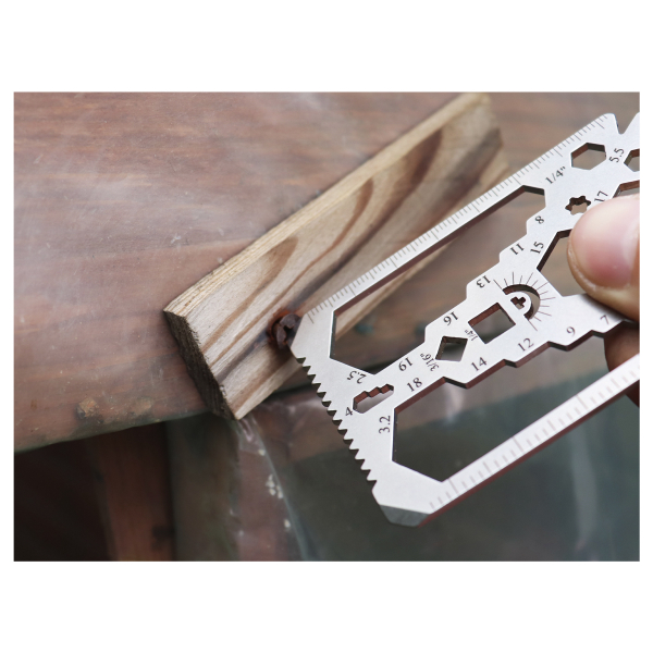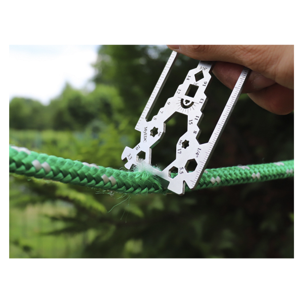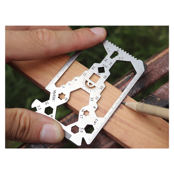 MyEDC Wallet Card 34in1 er et ekstremt smart og holdbart multifunktionelt værktøj med 34 forskellige funktioner, som kun er 2 mm tykt og vejer 32 gram. Hele værktøjet er lavet af 420 rustfrit stål og derefter varmebehandlet til en hårdhed på 54 HRC, så du behøver ikke at bekymre dig om værktøjets holdbarhed ved hårdt brug! Wallet Card indeholder 34 forskellige funktioner, som gør det nemt at løse forskellige problemer, der opstår i hverdagen. 34in1-modellen indeholder praktisk talt alle de vigtigste værktøjer til hverdagsbrug samt til f.eks. camping eller cykling.