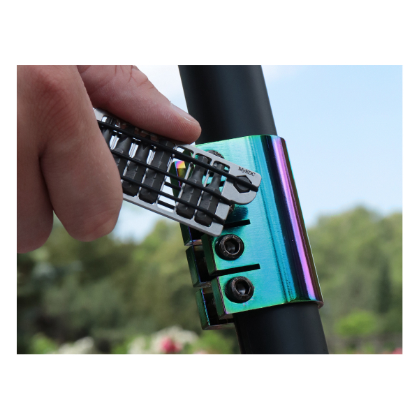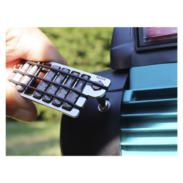 MyEDC Keychain 7 bits er et multifunktionsværktøj på 45 gram med 7 løse bits, der kan bæres på en nøglering. Hele værktøjet er fremstillet af 420 rustfrit stål og er varmebehandlet til en hårdhed på 54 HRC, så du behøver ikke at bekymre dig om værktøjets holdbarhed ved hårdt brug! Der medfølger 7 af de mest populære løse bits (3, 4, 5 og 6 mm insexnøgler, T25-nøgle og kryds- og flade stik), men du kan naturligvis ændre bitsene til dit eget brug. Desuden har værktøjet en 1/4" nøgle, der kan bruges til at bruge løse bits.