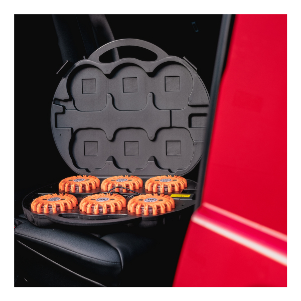 Opladningstaske til opladning, transport og opbevaring af 6 stk. LED-skildpadder. Oplades med 12V fra bilen eller 230V fra stikkontakt. Skildpadderne indgår ikke!