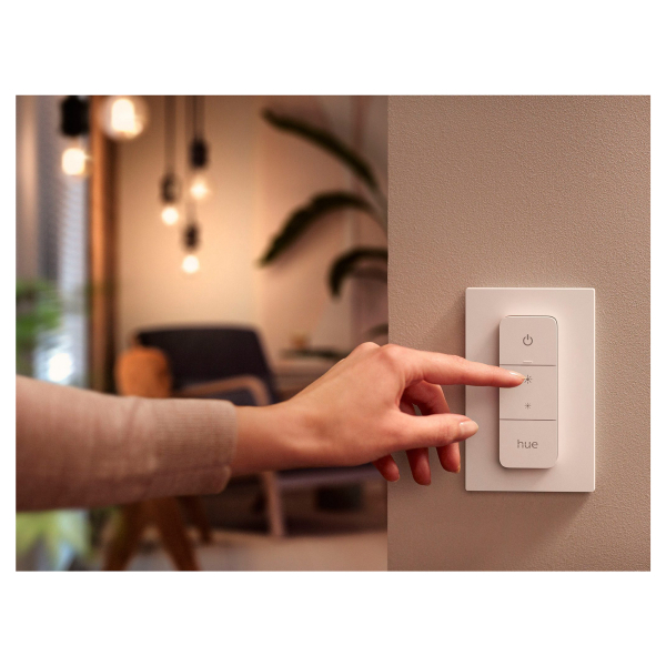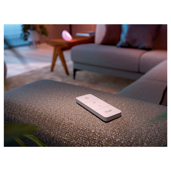 Philips Hue Dæmpbar Kontakt er en kontakt og fjernbetjening, som giver dig mulighed for at dæmpe, slukke og oplyse hele eller dele af dit hjem. Hue-dæmperen kan fastgøres på vægge eller magnetiske overflader, men den kan også bruges som en separat fjernbetjening, når det er nødvendigt, så det er nemt at styre belysningen fra f.eks. sofaen. Hue Dæmpbar Kontakt kan parres med din Philips Hue Bridge (købes separat) for at få flere funktioner til dit smarte hjem. Fjernbetjeningen drives af et CR2032-batteri (medfølger).