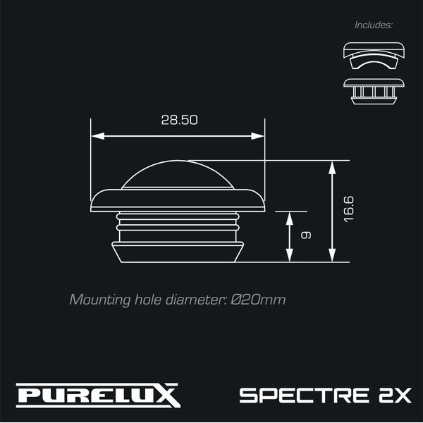 Purelux Spectre 2X Dark er et kompakt men kraftfuldt positionslys, som indgår i Spectre-serien, en serie specielt udviklet til erhvervschauffører og deres behov. Spectre 2X er usædvanligt små i kategorien positionslys og monteres direkte i køretøjets karrosseri, hvilket gør dem til en perfekt løsning til blandt andet personbiler, varevogne, motorcykler, firhjulere, minigravere, trucks samt alle køretøjer, der skal kunne ses i alle situationer, men hvor installationspladsen er begrænset. Serien omfatter orange, rødt og hvidt positionslys, alle godkendt til vejtrafik i henhold til ECE R148-standarden. Med samme serie kan køretøjet udstyres med matchende positionslys foran (hvidt), på siderne (orange) og bagpå (rødt), hvilket giver et ensartet og moderne udtryk. Medfølgende monteringsbaser gør installationen mulig både på plane og buede overflader, hvilket gør lysene nemme at installere næsten hvor som helst.