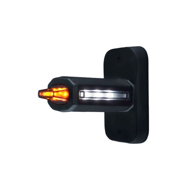 Moderne sidemarkerings-/positionslys, der kombinerer tre lysfunktioner: hvid foran, rød bagpå og orange sidemarkering. R148 vejtrafikgodkendelse, driftsspænding 12-24V, beskyttelsesklasse IP6K9K.
