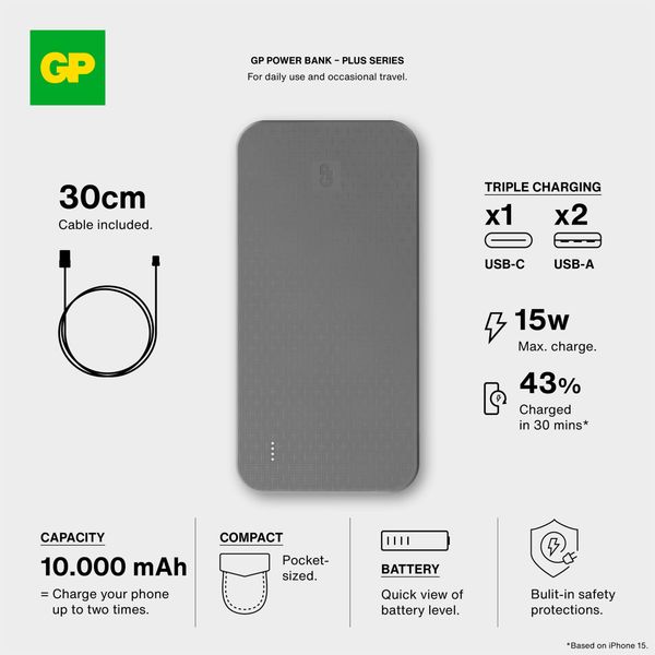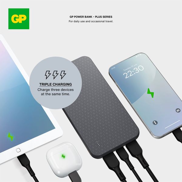 GP Plus er en 10.000 mAh powerbank, som holder dine enheder opladet, uanset om du er på rejse eller hjemme. Powerbanken har to USB-A-porte og en USB-C-port, så du kan oplade op til tre enheder samtidig. Det slanke og lette design gør den nem at have med, og den høje opladningseffekt betyder hurtig opladning. Du kan f.eks. oplade en mobiltelefon fra 0 til 50 % på kun ca. 35 minutter. Med sin høje kapacitet kan GP Plus oplade en smartphone fra tomt batteri til fuldt op til to gange. Ideel til lange rejser eller dage, hvor du er langt fra en stikkontakt. Takket være dens evne til at oplade flere enheder på samme tid er den et godt valg for familier, rejsekammerater eller andre, der gerne vil have deres gadgets klar til brug!