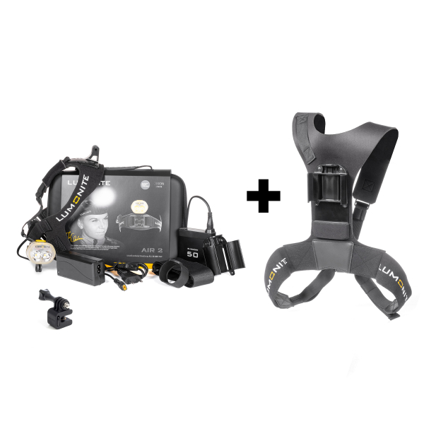 Ridningslampe-pakkens batteri opbevares praktisk i den medfølgende batterivest. Den kan også nemt lægges i lommen eller rygsækken. Lampen sættes fast i hjelmens skærm ved hjælp af det GoPro-kompatible beslag. Lampens monteringsfod gør det muligt at montere lampen direkte på hjelmen med et GoPro beslag, så længe hjelmens ydremateriale tillader dette. Samme GoPro adapter kan anvendes til at sætte lampen fast i andre GoPro beslag, hvilket nærmest giver dig uendelige monteringsmuligheder. Pandebåndet og forlængerledningen medfølger i pakken, og med disse kan du enkelt anvende Air2 som en helt normal pandelampe.