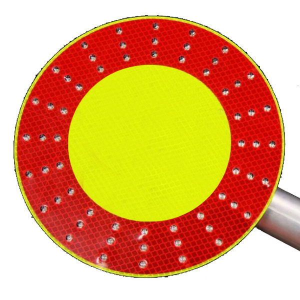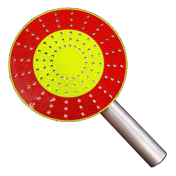 De røde og gule områder er oplyst. LED'erne giver henholdsvis gult og rødt lys. Drives af et 9V-batteri, der holder i ca. et år ved professionel brug. Batteriet er placeret i håndtaget sammen med et ekstra batteri. Pakken indeholder et skilt, et batteri og en monteringsklemme.