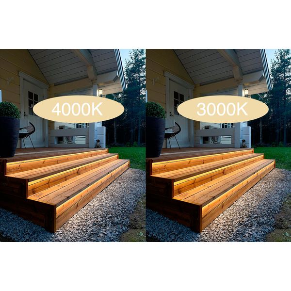 Sættet leveres med en 5 m strip, hvor du selv vælger effekt og farvetemperatur for at få præcis det lys, du ønsker. De medfølgende AGGE Corner-aluminiumprofiler muliggør en elegant montering, f.eks. i verandatrapper eller langs tag-væg-overgange på terrassen. Hver strip og profil kan om nødvendigt afkortes, hvilket gør det nemt at tilpasse belysningen til forskellige størrelser af terrasser, udhuse, verandaer, rækværk, trapper eller tage. De medfølgende profiler spreder lyset meget jævnt og giver et stilrent slutresultat samtidig med, at de beskytter LED-strippen mod ydre påvirkning. LED-strips er IP65-klassificerede og kan derfor om nødvendigt installeres uden profiler, også helt ubeskyttet udendørs.