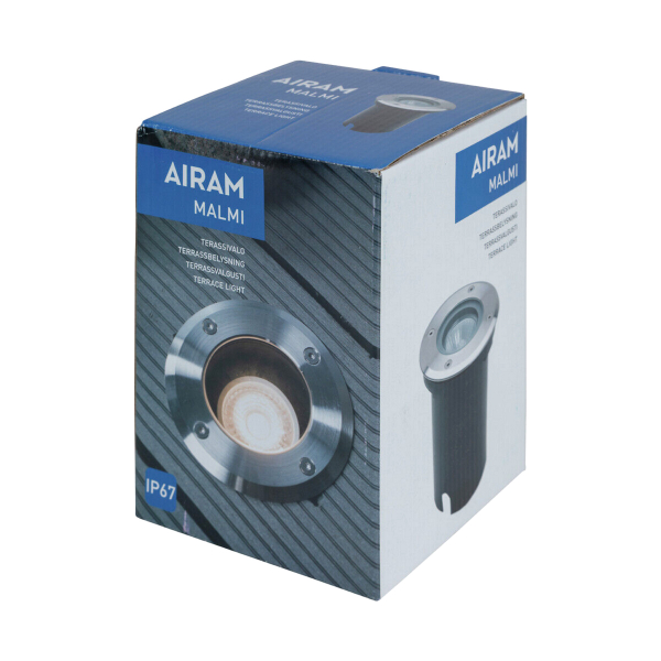 Airam Malmi er en elegant, indbygget terrasselampe til belysning af f.eks. terrasser og indgange. Den er støv- og vandtæt i henhold til IP65, og den hårde aluminiumsramme (monteringsboks af plast) kan tåle at gå på. Airam Malmi er vejrbestandig og bevarer sit udseende uden at ruste. Virker med en lampe med GU10-fod. Når du vælger en lyskilde, skal du overveje den ønskede farvetemperatur, lysmønster og effekt. Se vores GU10-serie her.