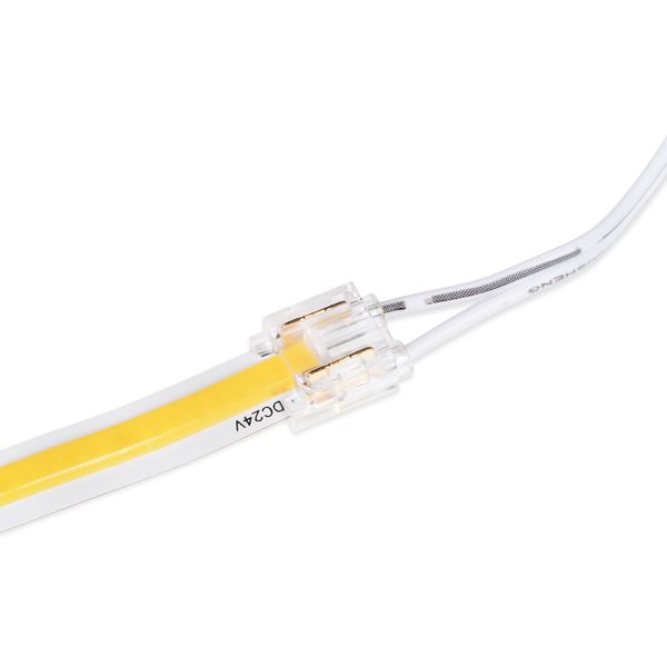 AGGE's tilslutningskabel til 8 mm eller 10 mm brede enkeltfarvede LED-strips. I den ene ende af kablet er der et 5,5 mm DC-hunstik, som passer direkte til AGGE's 12 og 24 V transformatorer, og i den anden ende er der et stik, som forbindes direkte til LED-stripsen. Med dette tilslutningskabel kan f.eks. en afklippet LED-strips hurtigt og nemt tilsluttes en transformer uden behov for ekstra lodning. Kablet er 200 cm langt, hvilket gør det muligt at placere LED-stripsen endnu længere væk fra transformeren. Stikket er velegnet til standard ensfarvede 8 mm eller 10 mm brede strips i tørre områder.