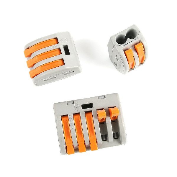 Kompakt og tidsbesparende tilslutningsklemme, der passer til alle ledningstyper op til 4 mm². Hurtig tilslutning af ledningerne uden værktøj. Kan åbnes og lukkes igen. Tilslutningsklemmen kan bruges til at forbinde 2, 3 eller 5 ledninger.