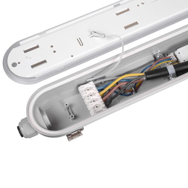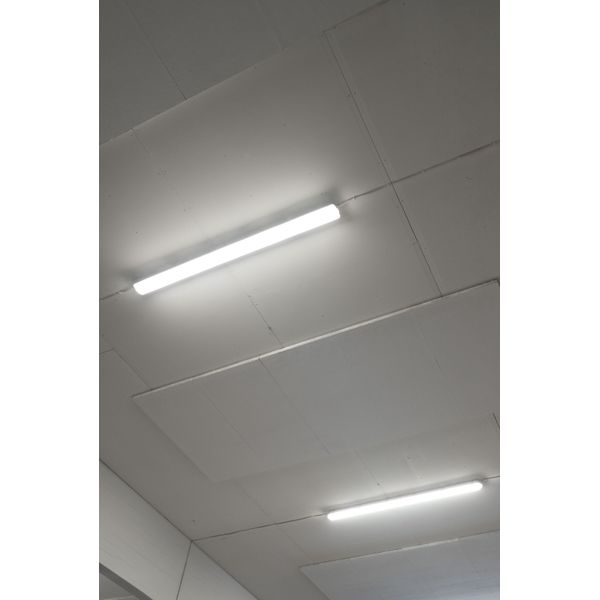 Kraftfuld universallampe designet til effektiv belysning af lager, garage og haller. Den 120 cm lange slag-, vand- og støvtætte konstruktion er også velegnet til industrielle behov. Deklareret lysstrøm 5200 lumen, neutral farvetemperatur 4000K og farvegengivelsesindeks 80Ra. Kan monteres direkte i loftet eller hænges op, f.eks. med wirer. Velegnet til både tørre og fugtige rum.