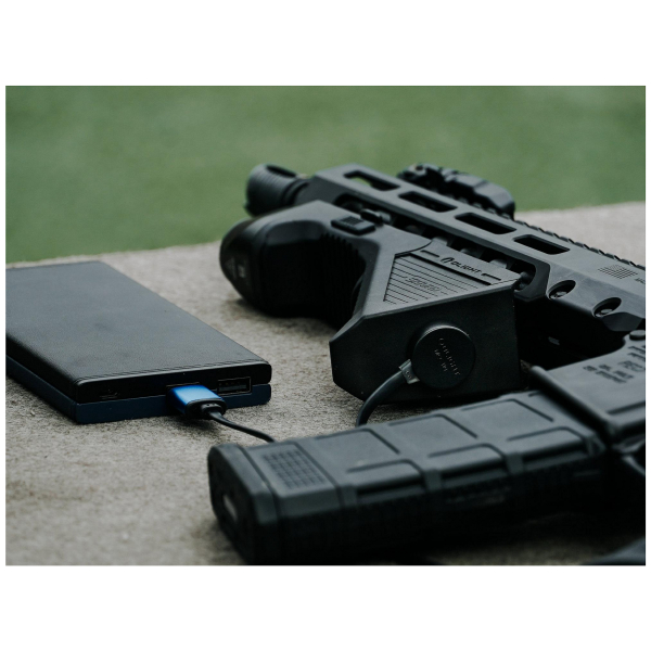 Lampen kan tændes og slukkes med en af kontakterne, og driftstilstanden kan skiftes mellem High og Low-effekt fra samme kontakt. På denne måde behøver du ikke ændre dit greb, og du behøver ikke tage øjnene fra målet, mens du justerer lyset. Den letvægtige Sigurd vejer kun 220 gram, så den tilfører ikke meget ekstra vægt til våbnet. Lygten arbejder med et integreret 2400 mAh Li-Po batteri, som garanterer, at lampen ikke løber tør under brug. Sigurd kan nemt oplades gennem den magnetiske ladeport på bagsiden af lampen ved hjælp af den medfølgende oplader. Den magnetiske ende af opladeren fastgøres til lampen, hvilket gør opladningen meget nem. Takket være placeringen af ladeporten er det heller ikke nødvendigt at fjerne lyset fra våbnet under opladning. I henhold til IPX4-klassificeringen er Sigurd beskyttet mod vandsprøjt, så den kan bruges uanset vejrforhold i enhver situation. Udover Picatinny-skinnen kan Sigurd også fastgøres til M-LOK-skinnen ved hjælp af en Picatinny-skinneadapter (medfølger ikke). To års (24 måneder) garanti!