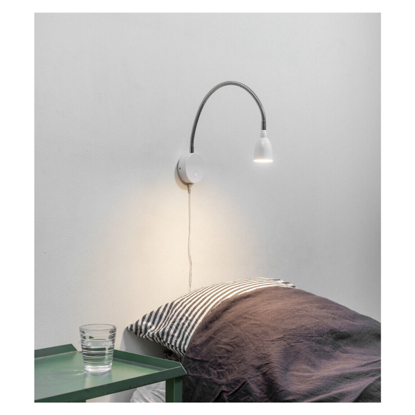 En slank væglampe med 280 lumen i lysflow, f.eks. til montering på et sengegavl. Foldbar arm.