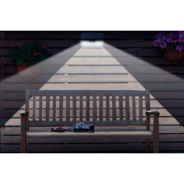 En lampe med en bevægelsesdetektor og en bredt lysbillede, som får sin strøm direkte fra solen. Velegnet til belysning af f.eks. stier, trapper og indgange. Kan også bruges i sommerhuse eller på byggepladser uden elektricitet. Oplyst lysflow 1100 lm. Kapslingsklasse IP65.