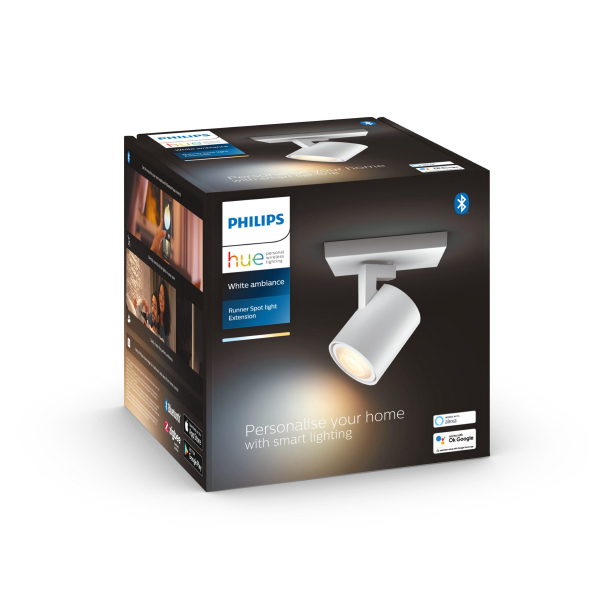 Philips Hue Runner er en stilfuld, spotlys-lignende væglampe, der passer til tørre interiører i hjemmet, og som kan styres via Philips Hue-applikationen. Lampen fungerer med en udskiftelig GU10 Philips Hue smart LED-pære, så den kan tilsluttes Philips Hue-smart belysningssystem. Ud over selve lampen leveres pakken med en Philips Hue Ambience-pære, hvis justerbare farvetemperatur på 2200 - 6500 K er perfekt til generel belysning og stemningsbelysning i hjemmet! Lampens spotlys er retningsbestemt, så lyset kan fokuseres præcis, hvor du ønsker det. Runner har indbygget belysning, der er designet til at gøre hverdagen lettere. Ud over de færdige lysindstillinger kan lampen justeres trinløst til den ønskede farvetemperatur via Philips Hue-applikationen. Runner er ligesom alle produkter i Hue-serien kompatibel og kan styres via en smartphone, Hue Bridge eller en Hue Dimmer Switch. Lampen kan naturligvis også tændes og slukkes med en almindelig afbryder. Deklareret lysflow 400 lumen, farvetemperatur 2200 - 6500 Kelvin. Findes i sort og hvid. To års garanti!