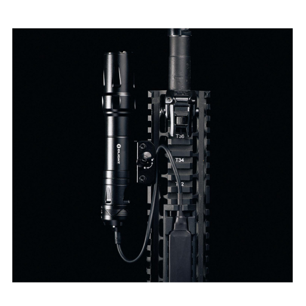 Den medfølgende fjernbetjening gør det nemt at styre lyset mens du har fat i våbnet. Der er ca. 15 cm kabel mellem fjernbetjeningen og lygten, så fjernbetjeningen kan f.eks. placeres på våbnets håndtag på siden eller i nærheden af skydeskinnen. Fjernbetjeningen leveres med en Picatinny-kompatibel "base". Ved at trykke på fjernbetjeningen kan du tænde lyset kortvarigt eller med kontinuerligt lys. Fjernbetjeningen har også en innovativ låsemekanisme som sikrer at den forbliver fast på plads, selv når våbnet affyres,og ikke løsnes fra rekylen.